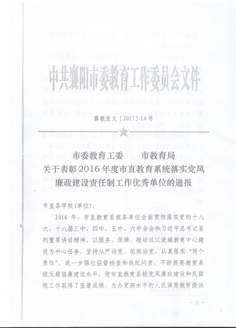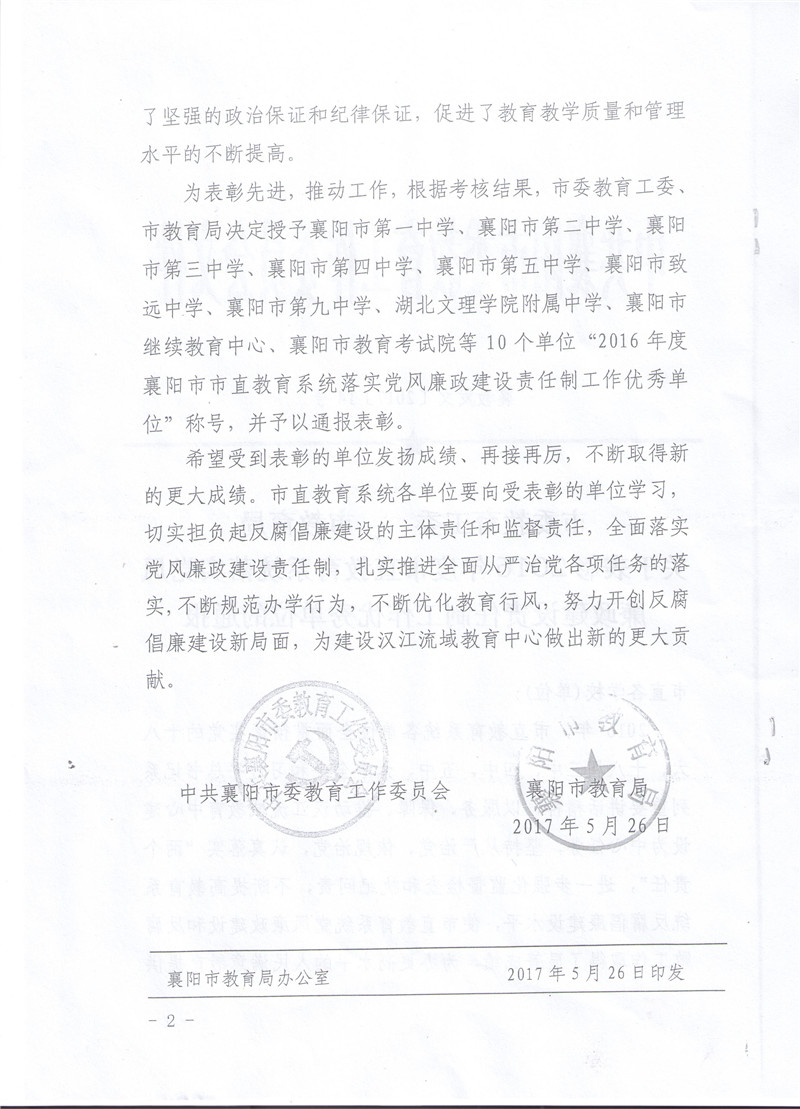 市委教育工委、市教育局关于表彰2016年度市直教育系统落实党风廉政建设责任制工作优秀单位的通报