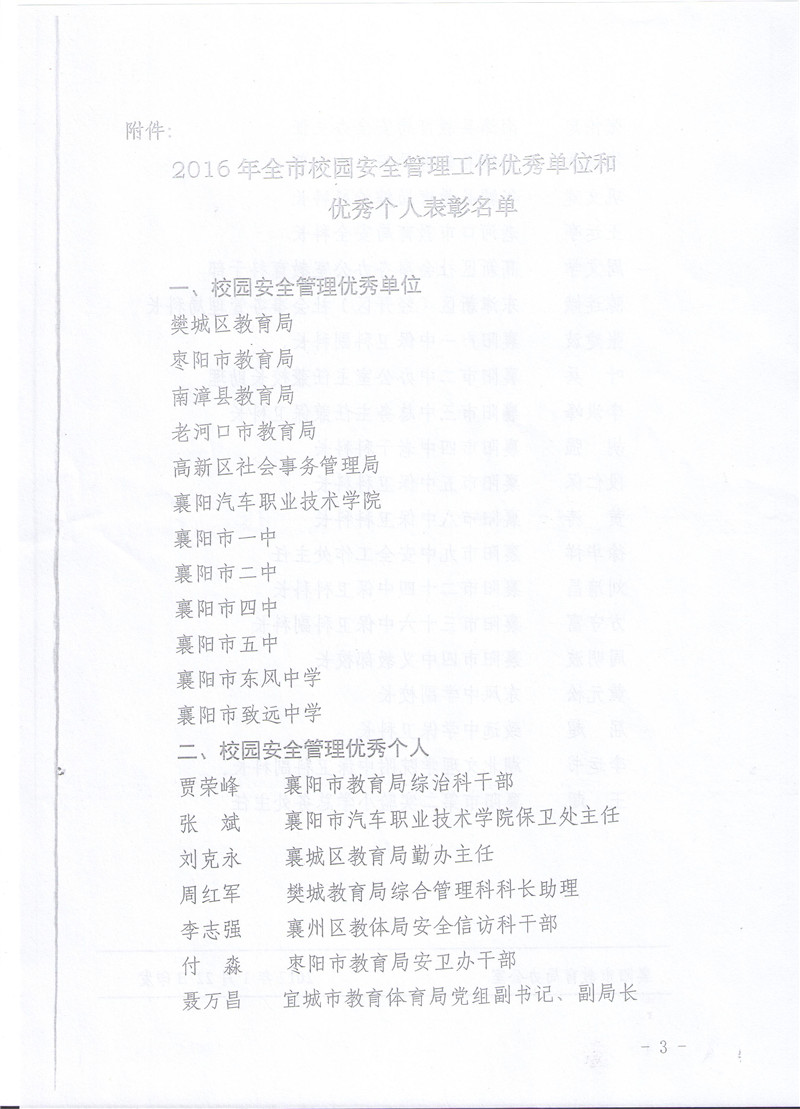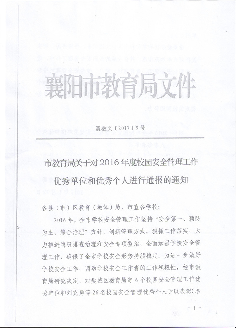 市教育局关于对2016年度校园安全管理工作优秀单位和优秀个人进行通报的通知