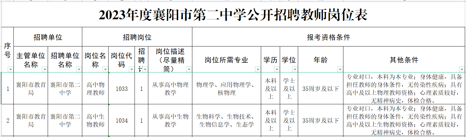 2023年度襄阳市第二中学公开招聘教师岗位表