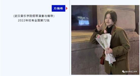 2017年来,我校音乐生联考连续5年通过率均为100%,为诸多高校输送了大量优秀音乐人才。如:刘乐萌同学考入星海音乐学院,林晨阳同学考入中央戏剧学院,王博韬、周茜茹、谢聪颖等考入武汉音乐学院。2022年高考,18名音乐特长生文化课专业课双过线达到100%。其中,王超同学摘取武汉音乐学院通俗声乐演唱与编导专业全国第一名(2000多人参加)桂冠,考入武汉音乐学院。张俊鹏同学荣获武汉音乐学院声乐系校考全国第12名(3000多人参加考试)。