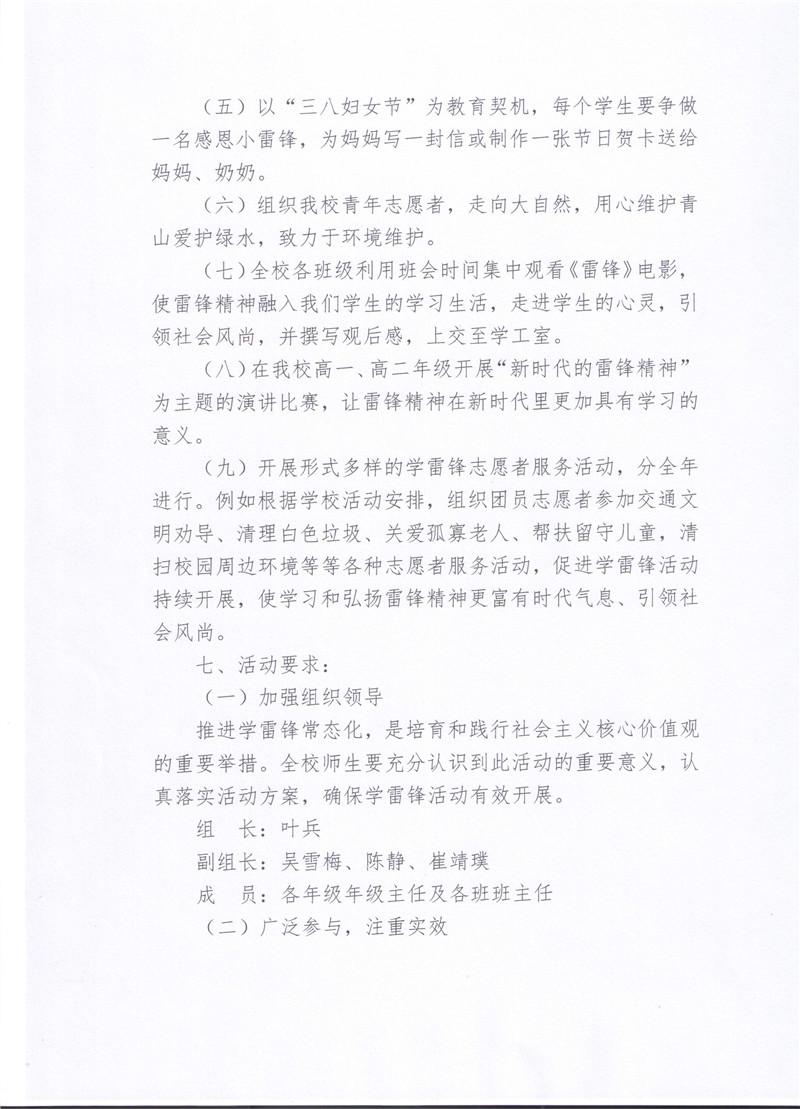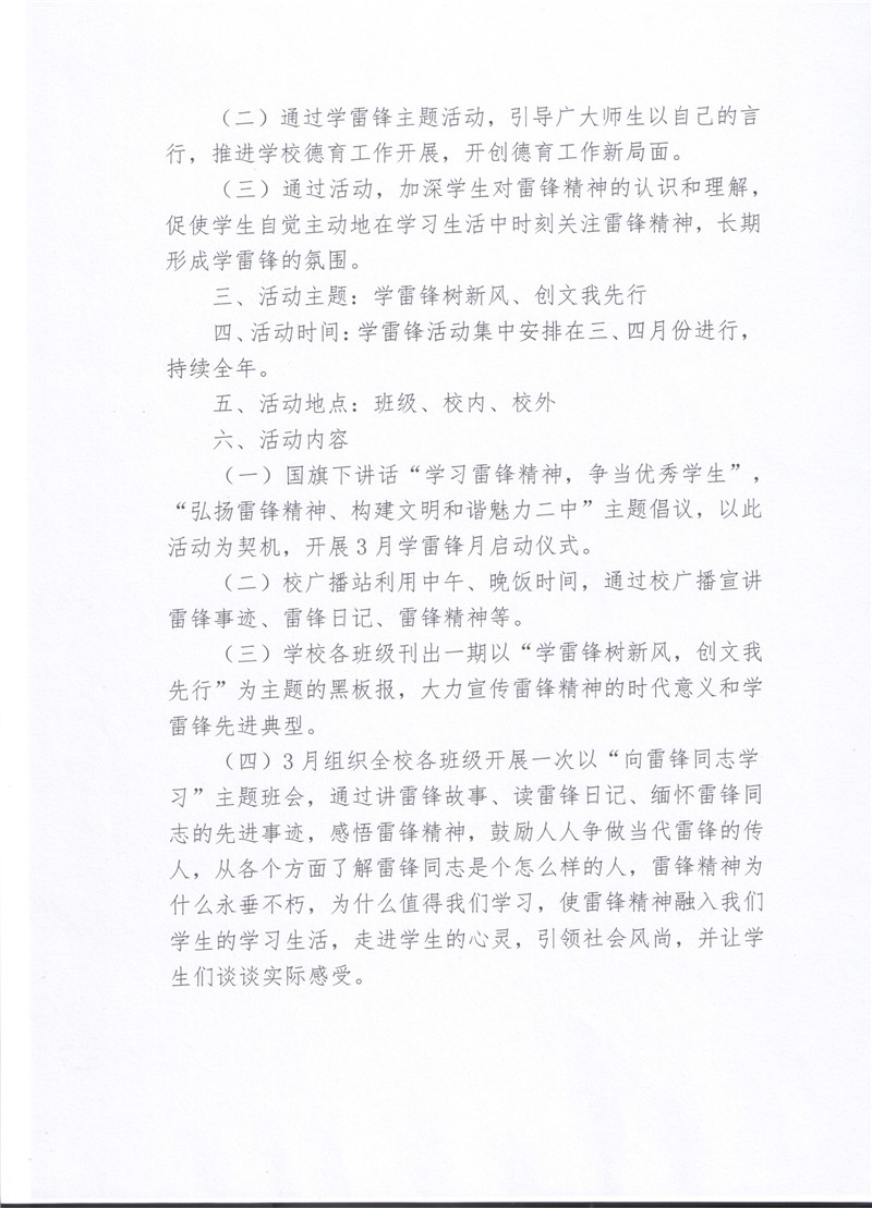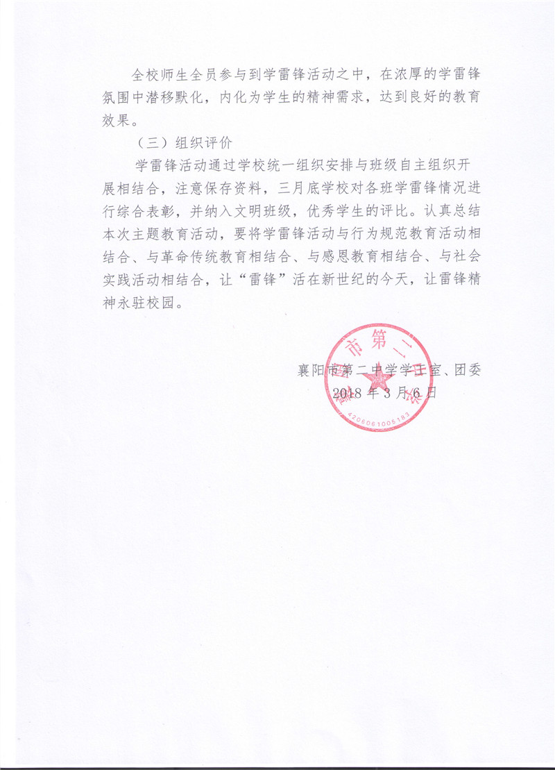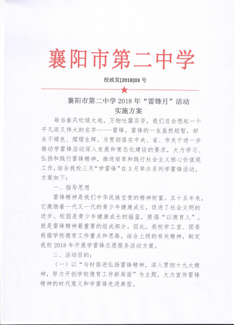 襄阳市第二中学2018年“雷锋月”活动实施方案