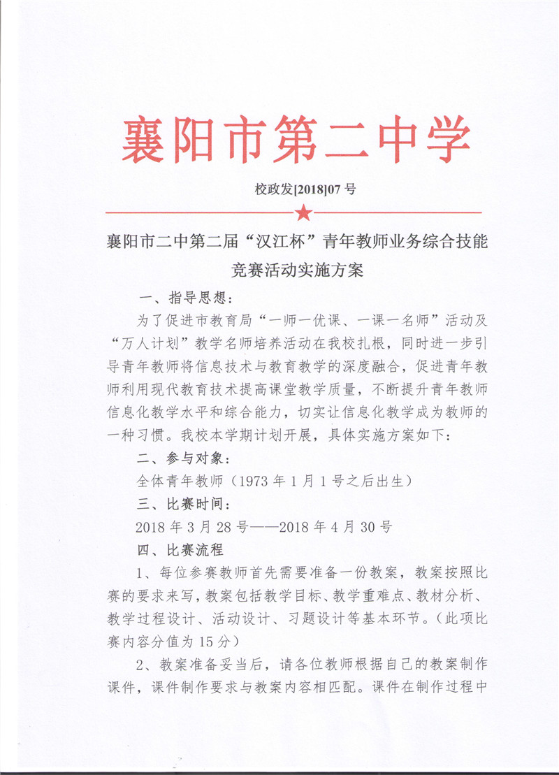 襄阳市二中第二届“汉江杯”青年教师业务综合技能竞赛活动实施方案