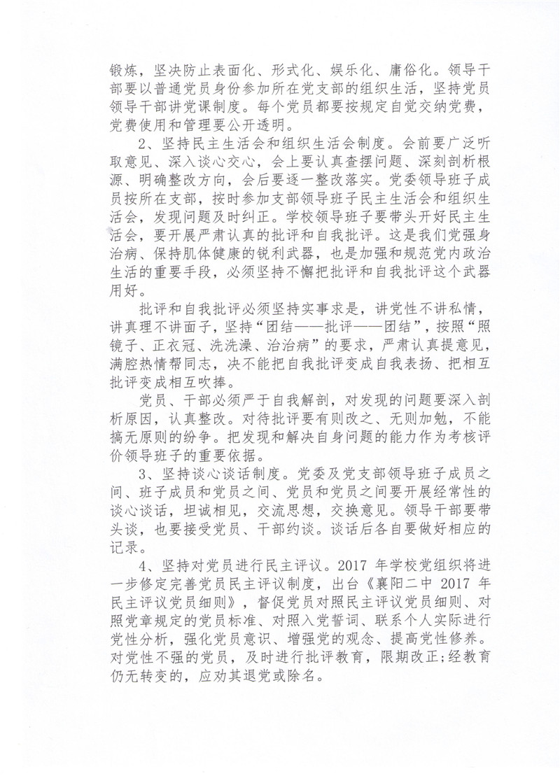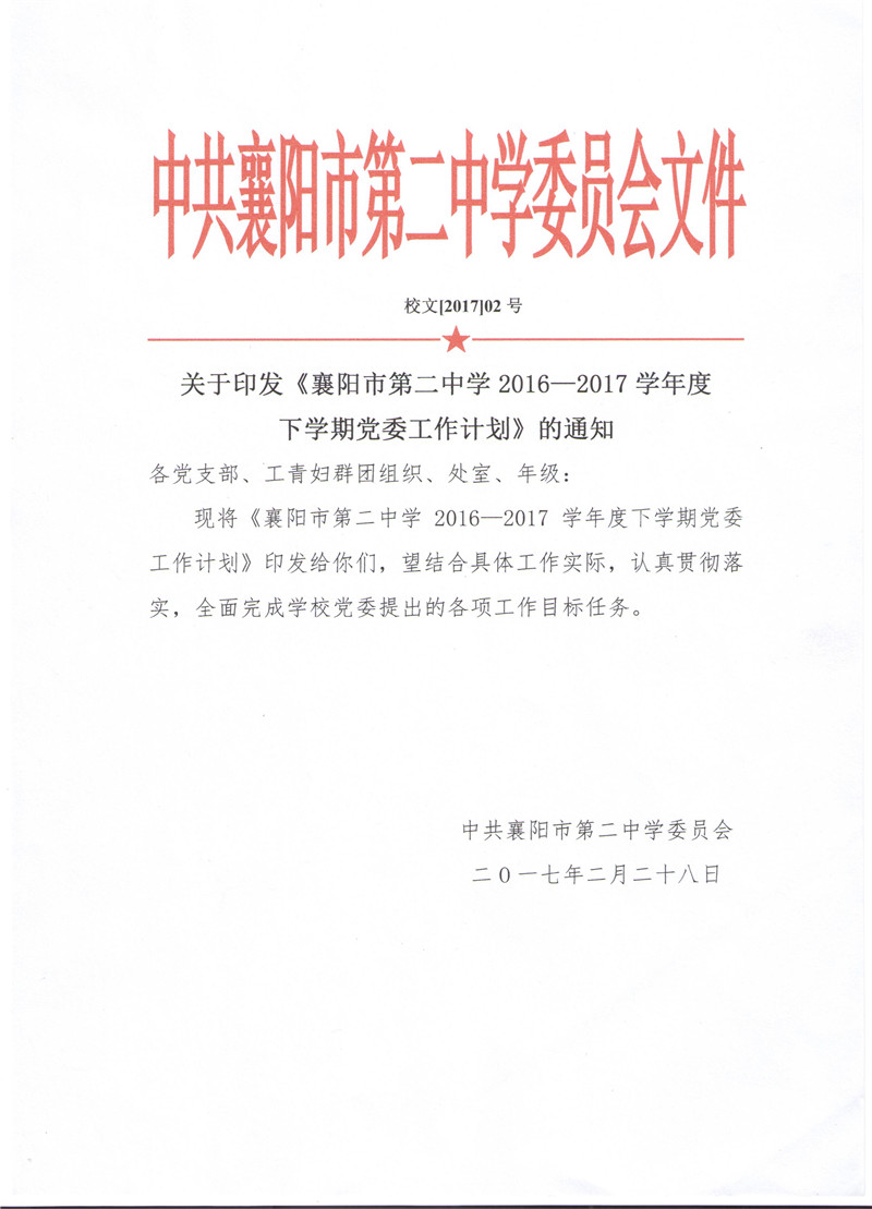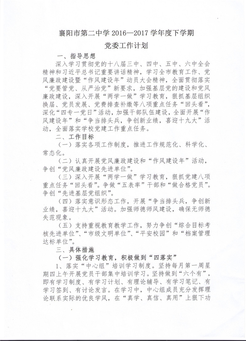 襄阳市第二中学2016-2017学年度下学期党委工作计划