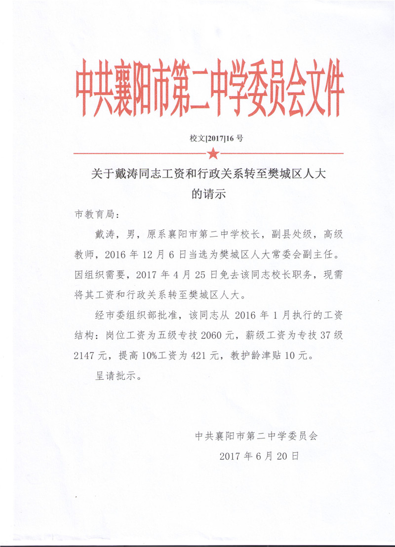 关于戴涛同志工资和行政关系转至樊城区人大的请示