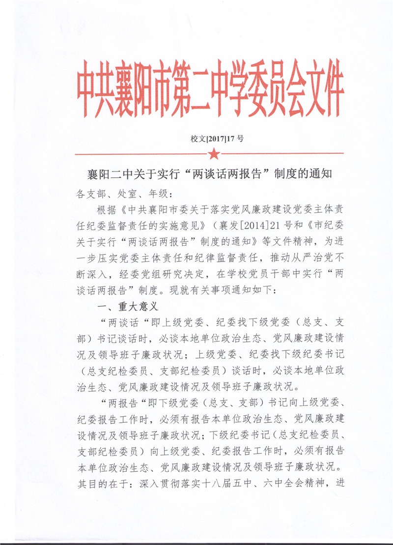 襄阳二中关于实行“两谈话两报告”制度的通知