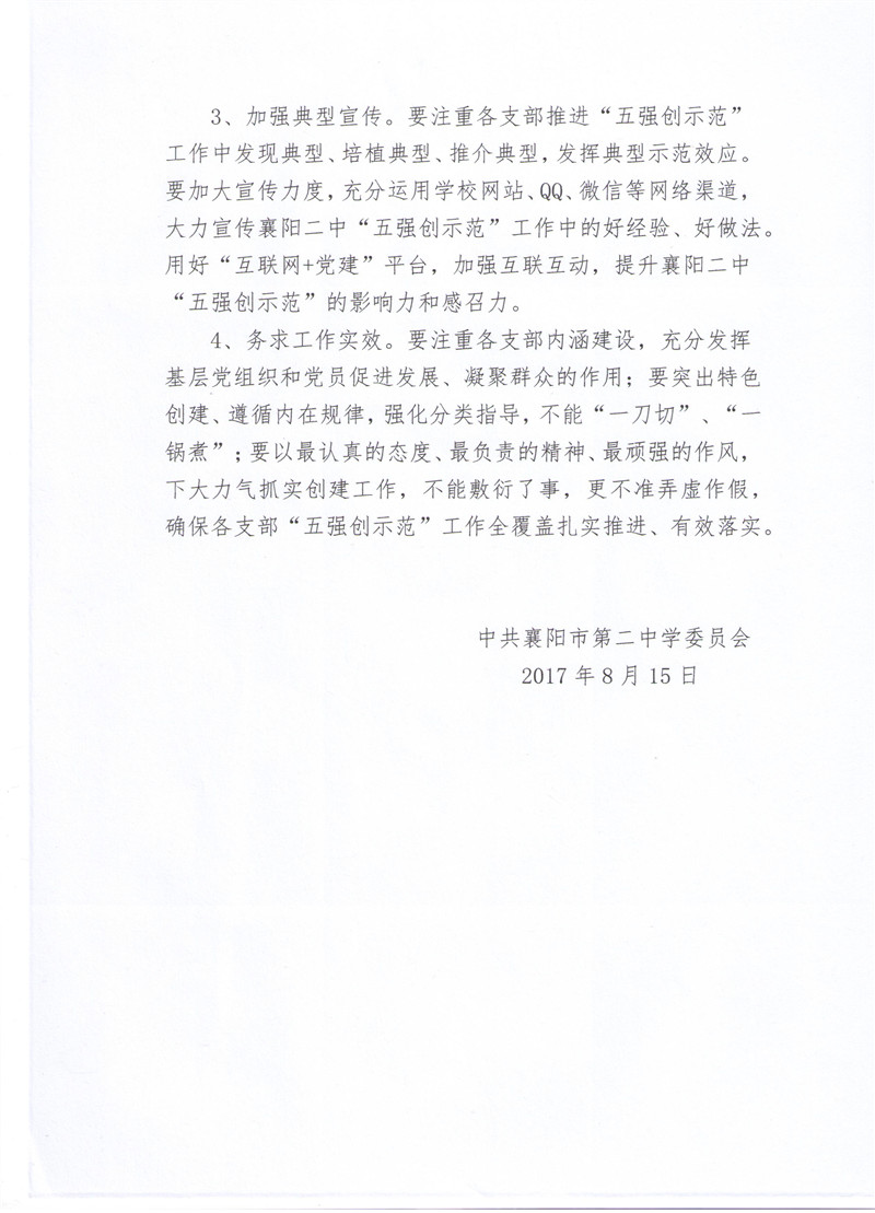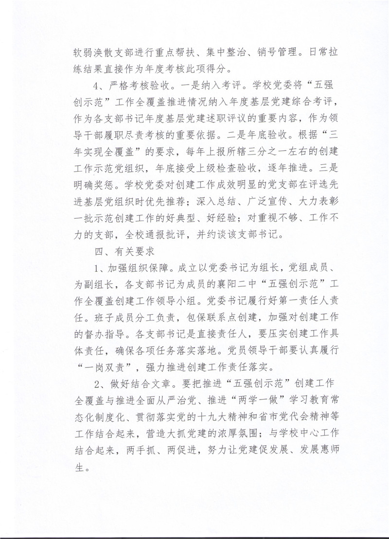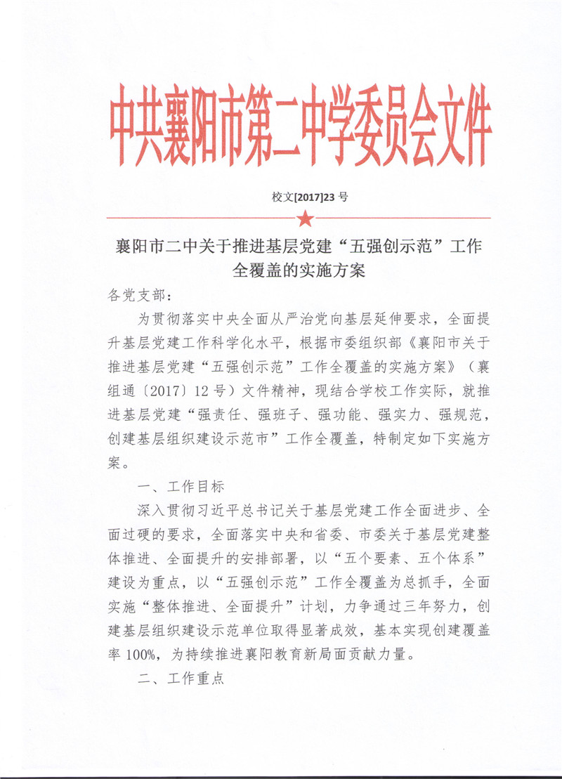襄阳二中关于推进基层党建“五强创示范”工作全覆盖的实施方案