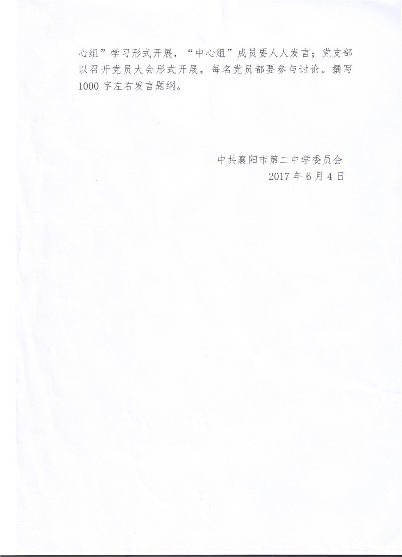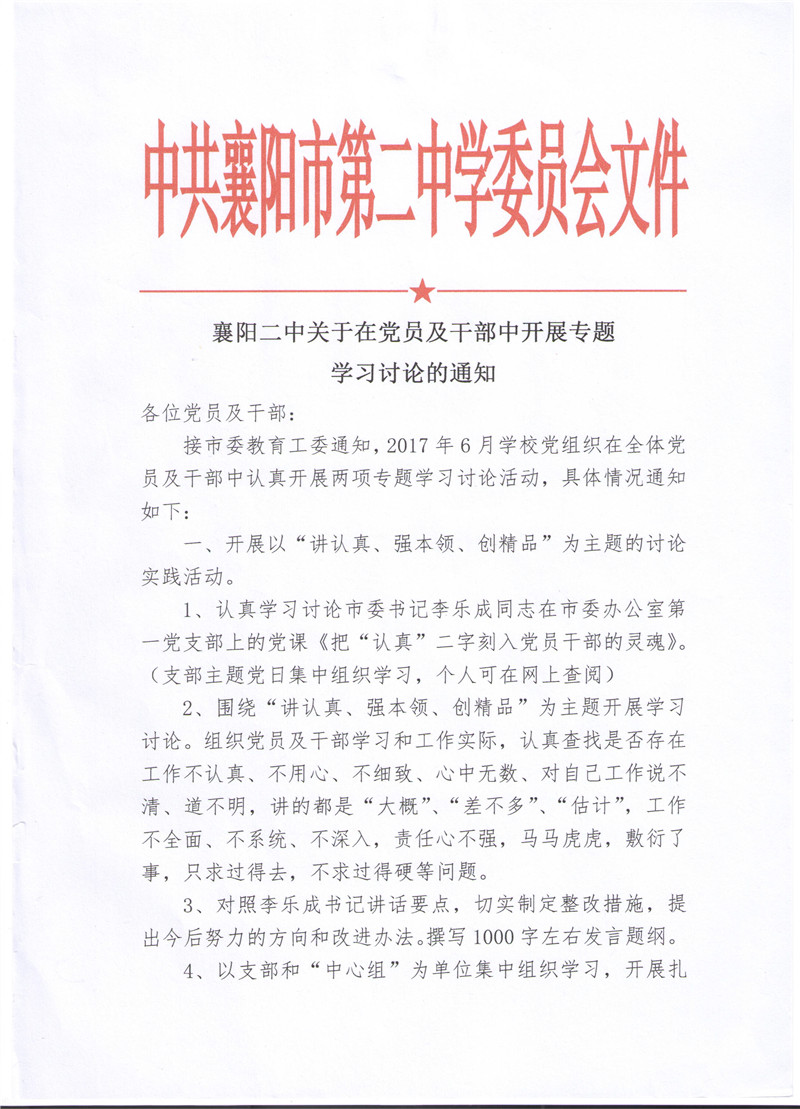 襄阳二中关于在党员及干部中开展专题学习讨论的通知