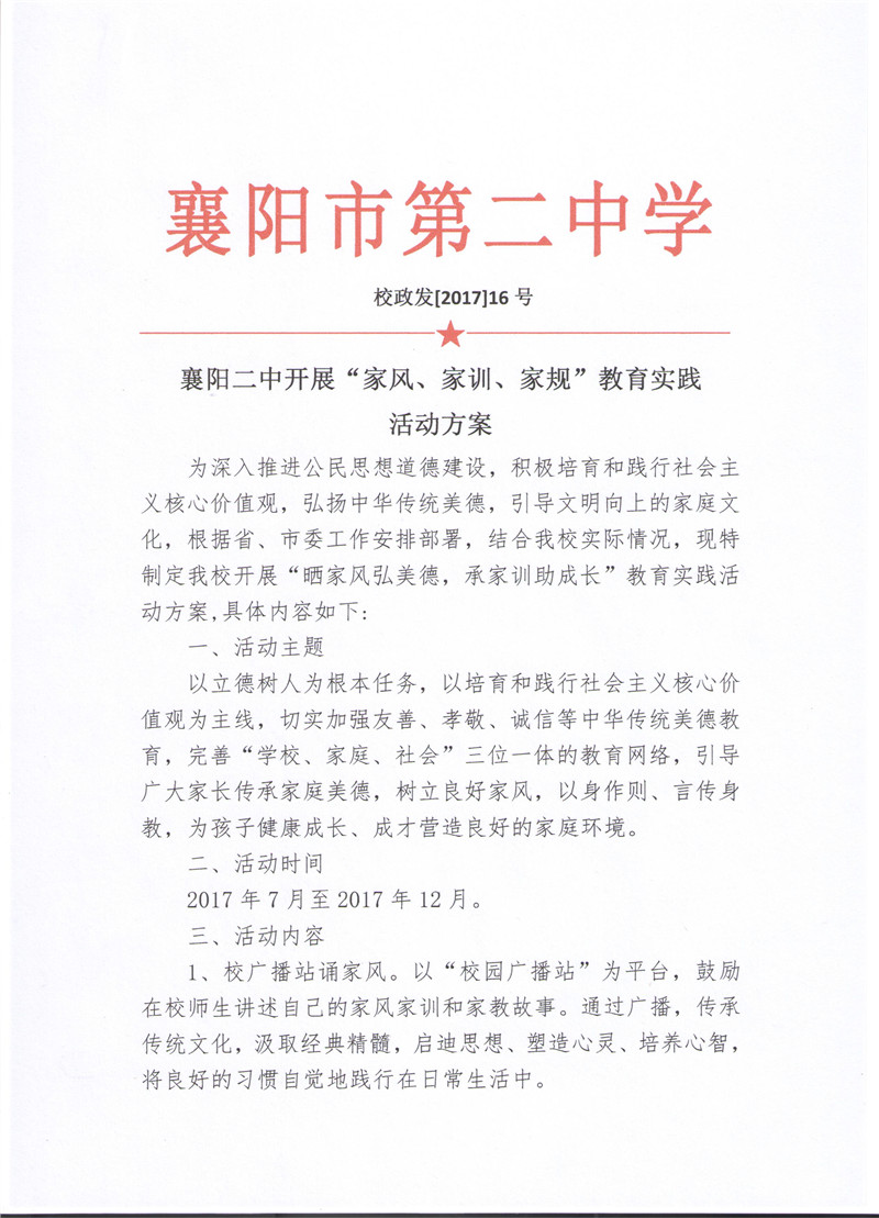 襄阳二中开展“家风、家训、家规”教育实践活动方案