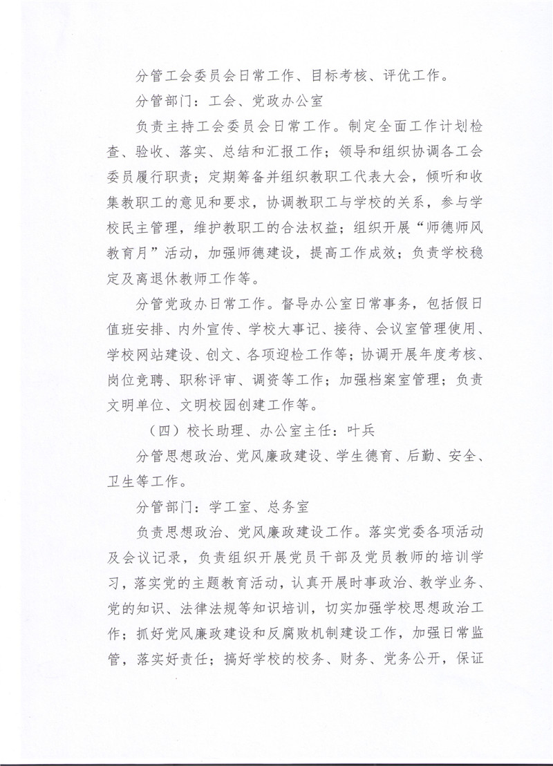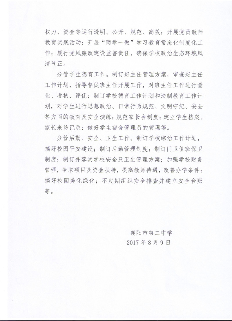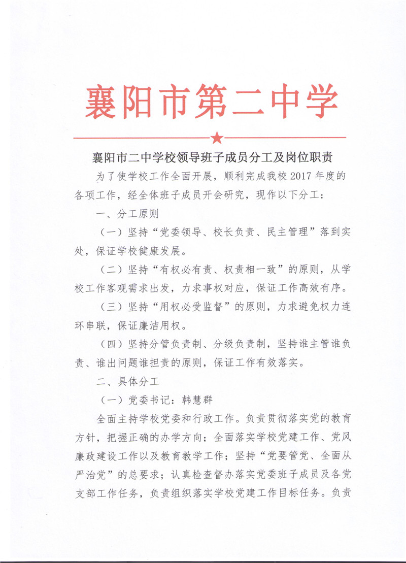 襄阳市第二中学校领导班子成员分工及岗位职责