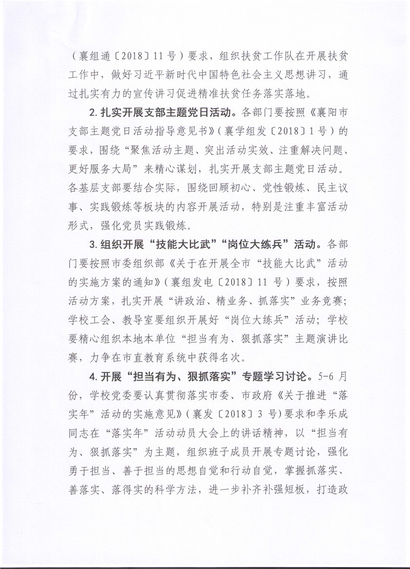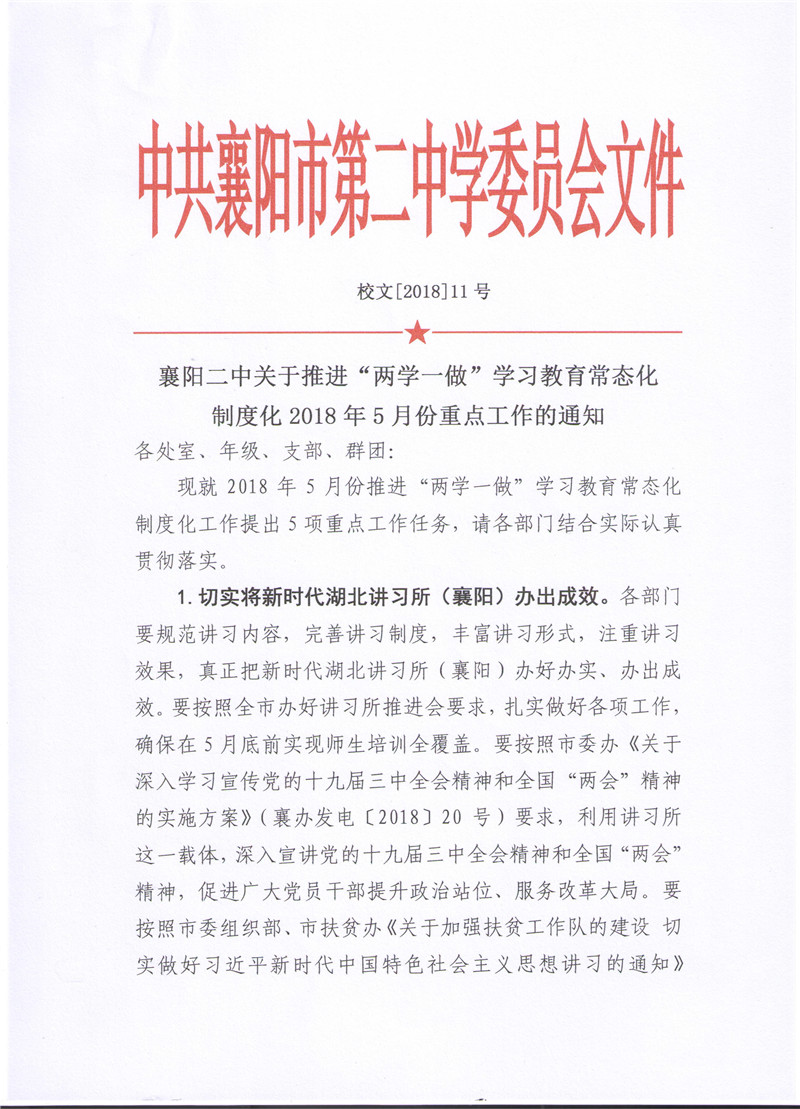 襄阳二中关于推进“两学一做”学习教育常态化制度化2018年5月份重点工作的通知