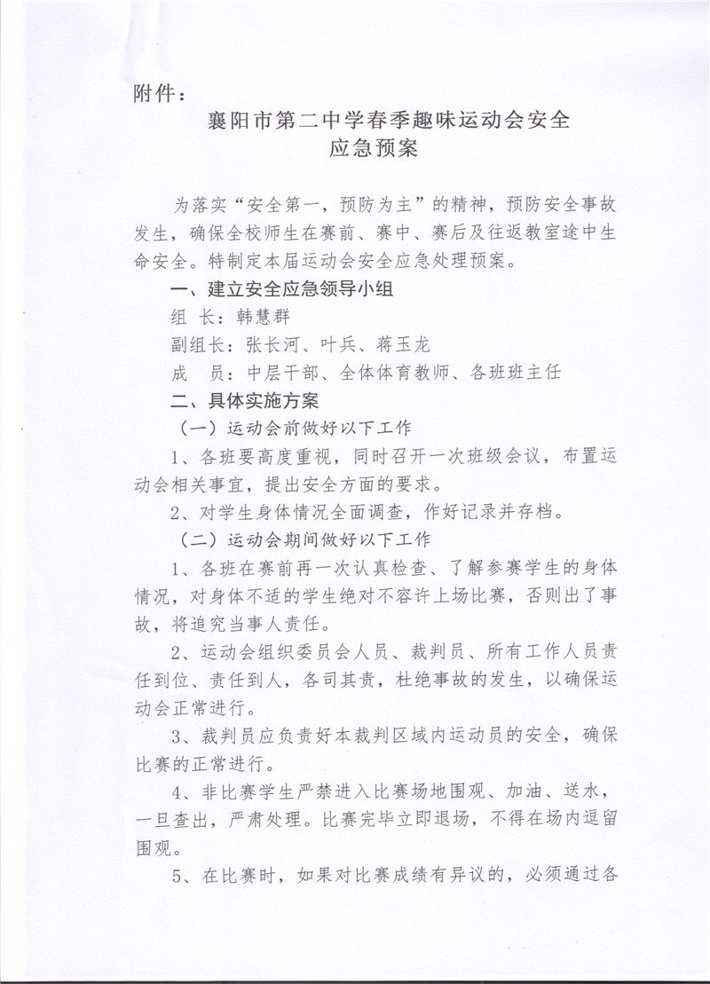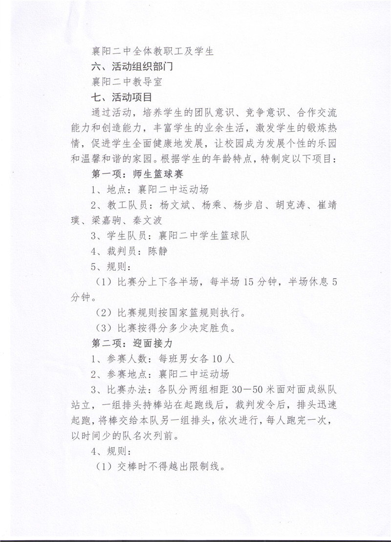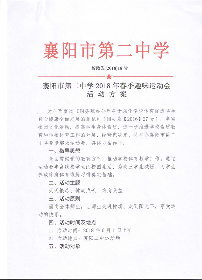 襄阳市第二中学2018年春季趣味运动会活动方案