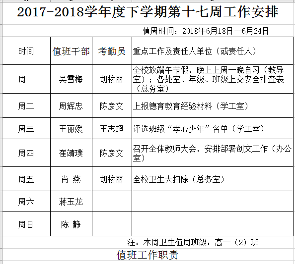 5、17:50—18:40,值班干部到岗,关注校园、食堂、教学楼秩序。