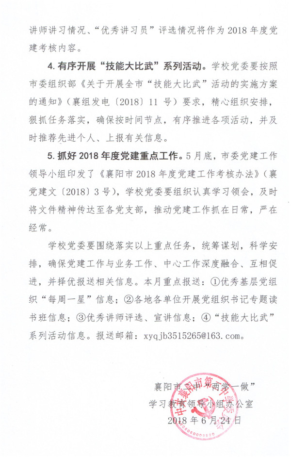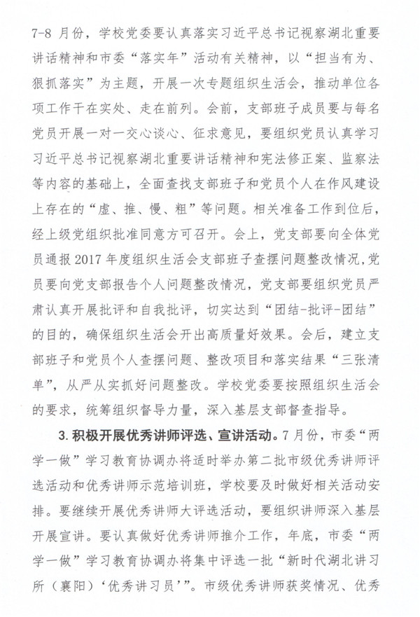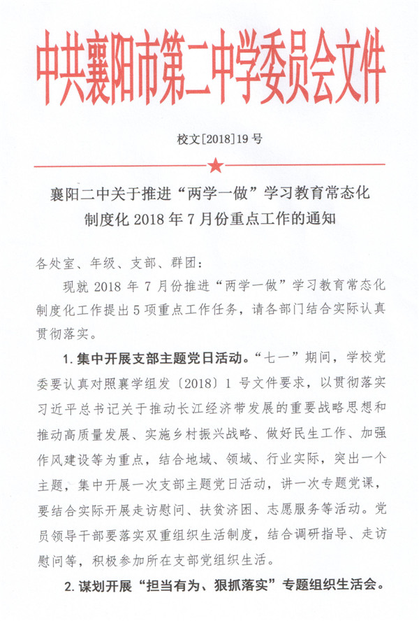 襄阳二中关于推进“两学一做”学习教育常态化制度化2018年7月份重点工作的通知