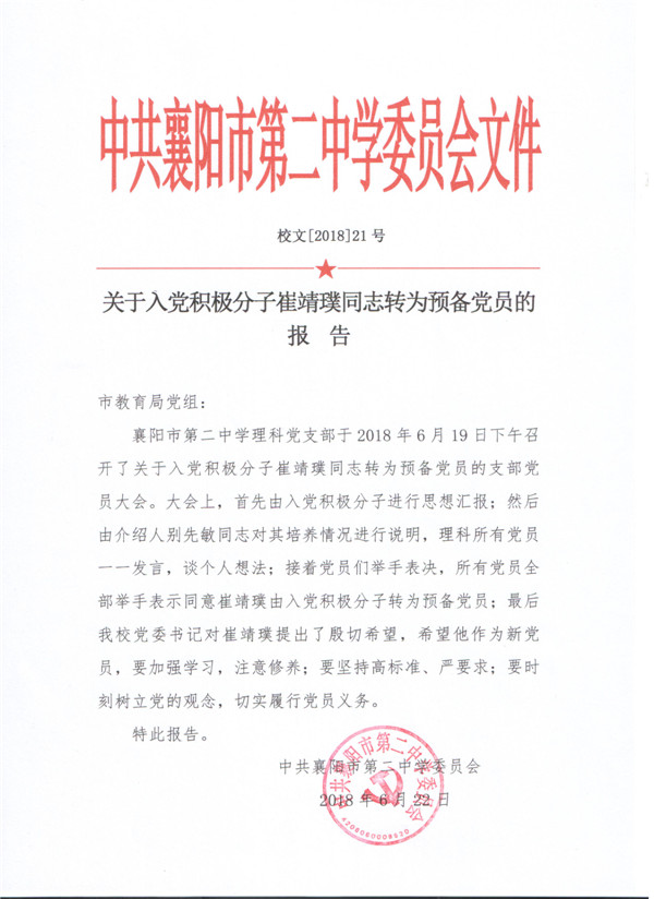 关于入党积极分子崔靖璞同志转为预备党员的报告