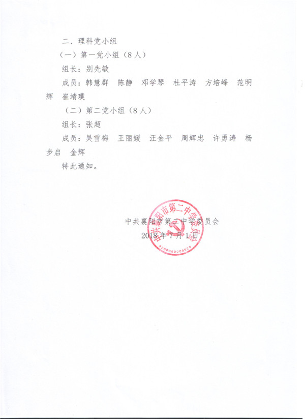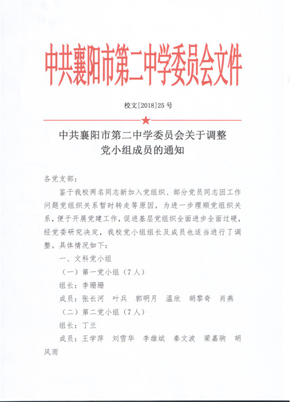 中共襄阳市第二中学委员会关于调整党小组成员的通知