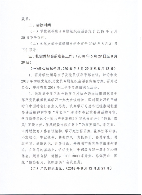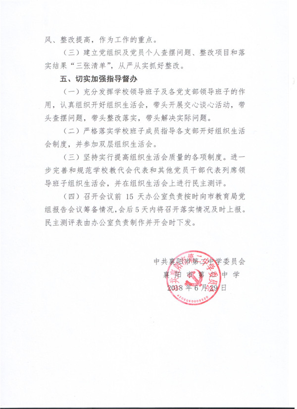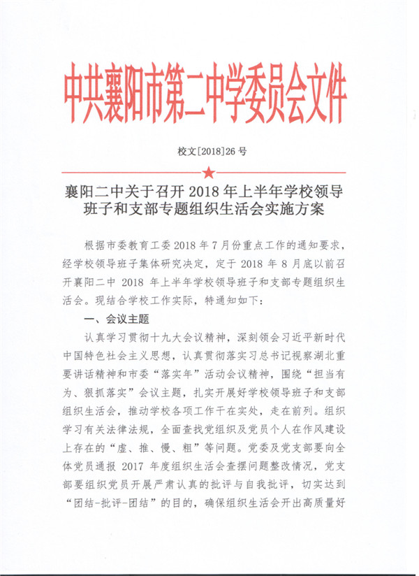 襄阳二中关于召开2018年上半年学校领导班子和支部专题组织生活会实施方案