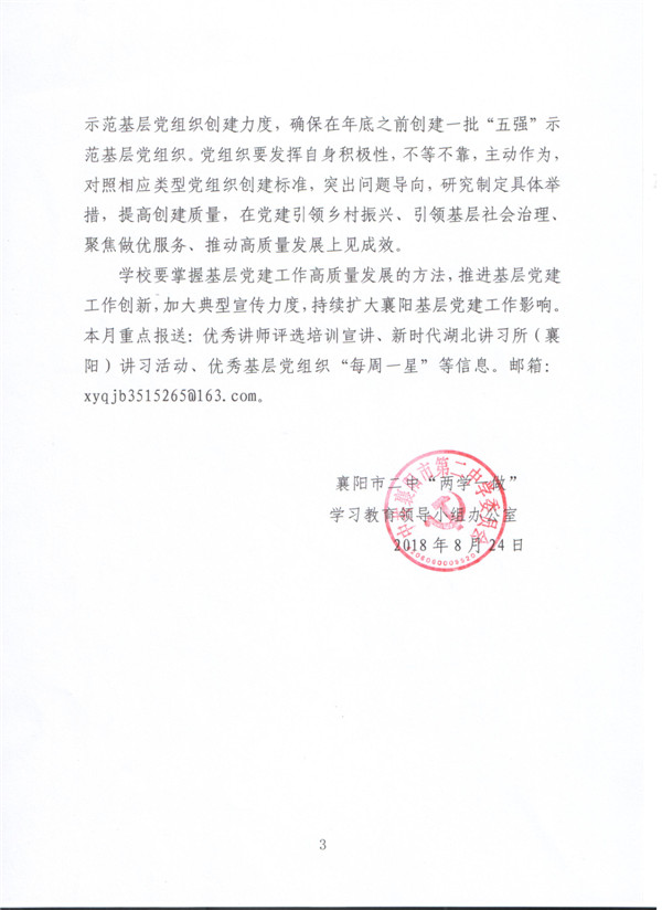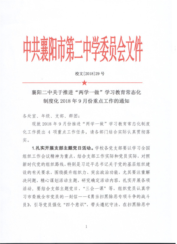 襄阳二中关于推进“两学一做”学习教育常态化制度化2018年9月份重点工作的通知
