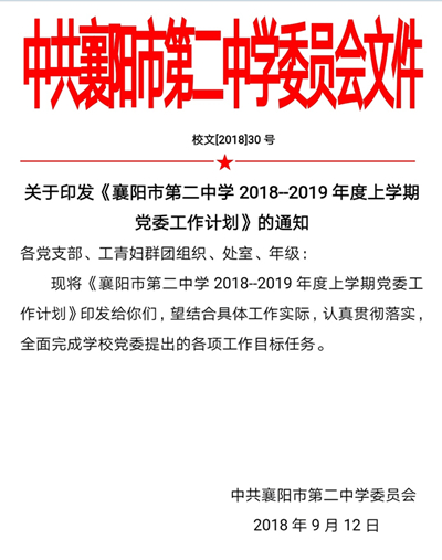 关于印发《襄阳市第二中学2018--2019年度上学期党委工作计划》的通知