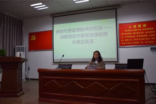 第二位发言的是我校政治教研组组长胡敏老师,她发言的题目是《新时代思政教师的担当》,她的学习心得很接地气,她就着眼于自己作为一名思政课教师要实现的几个目标谈了一谈:第一是实现知识性与德育性相统一;第二是实现理论性与实践性相统一;第三是实现供给侧与需求侧相统一;第四是实现积极性与创造性相统一。