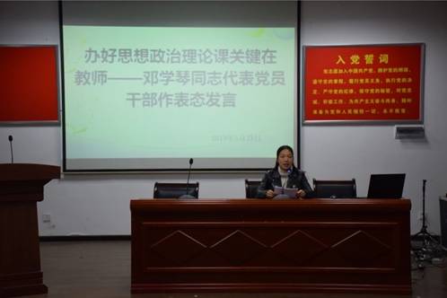 视频学习完以后,学校安排了三位很有代表性的教师谈心得体会。首先教导处主任邓学琴同志从学校教学全局谈了体会,她发言的题目为《办好思想政治理论课关键在教师》。她的发言对习总书记的讲话领悟很深,同时她站在学校教学的层面对全体教师提出了具体的要求:一是明确课堂教学是思政课工作的主渠道;二是各类课程要与思政课同向而行;三是要让思政课教学活起来。