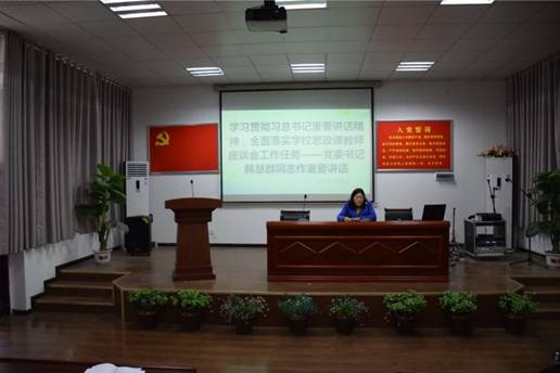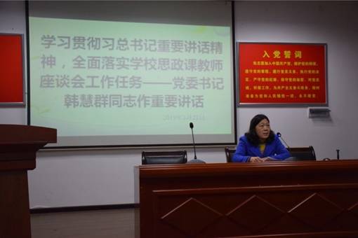 本次政治学习最后,我校党委书记韩慧群同志做了重要讲话,韩书记的讲话高屋建瓴,既对习总书记在思政课教师座谈会上的重要内容做了认真总结,又对全体教职工提出了要求。