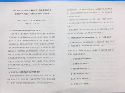 2019年3月28日下午,襄阳二中继3月21日全体教职工学习习总书记思政课座谈会上重要讲话之后,开展了第二次“上好思政课”系列活动。这次的活动由我校党委书记韩慧群同志深入教学一线,在高一(4)班为全班学生上了一节既有深度又有广度的思想政治理论课。