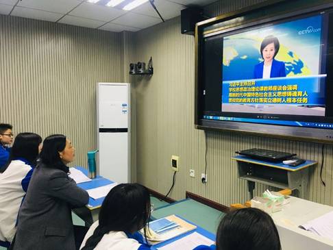 这次的思政课的第一个环节是让学生观看一段视频,视频内容为2019年3月18日习总书记召开了全国思政课教师的座谈会,同学们边看边在做笔记,很多同学都在资料上把“四个自信”,“八个统一”做了重点符号。