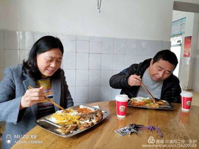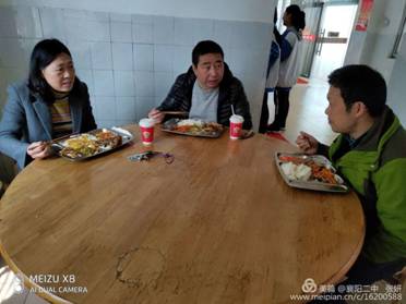午饭时间,韩书记和值班班主任罗老师、学校总务室主任周辉忠(右一),一起吃学生餐,边吃边谈,韩书记与罗老师,周主任就食堂今天的午饭饭菜情况进行意见交流。