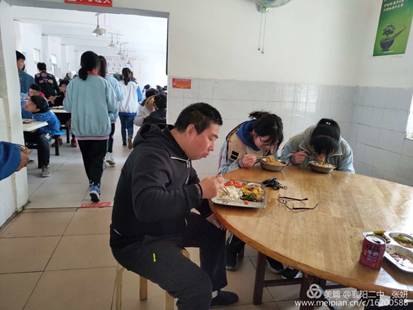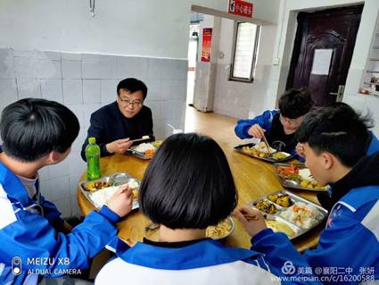 襄阳二中的书记、校长、干部、老师和学生一起吃饭,在一样的窗口打饭菜,菜色也都和学生一样。学生们在食堂吃饭由校长、老师们亲自陪餐,让他们感觉到学校食堂用餐很放心,很亲切,学习也更加有劲头。