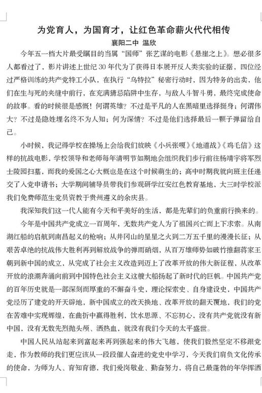 一百年峥嵘岁月,一百年奋斗不息,回顾党的光辉历程、重温红色历史。伟大的中国共产党带领全中国人民从“站起来”走向“富起来”再到“强起来”。襄阳市第二中学教师以演讲和征文的形式一起歌颂中国共产党一百年来为我们创造的丰功伟绩!
