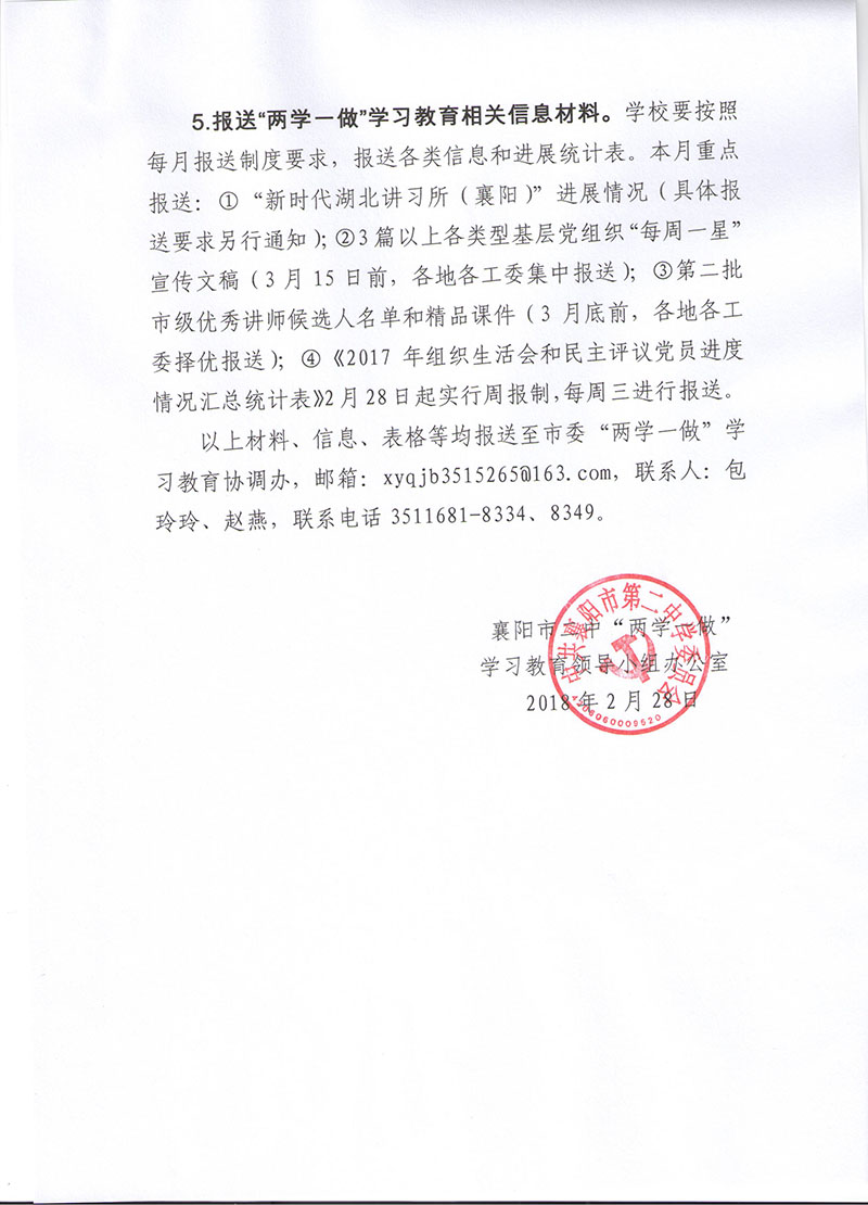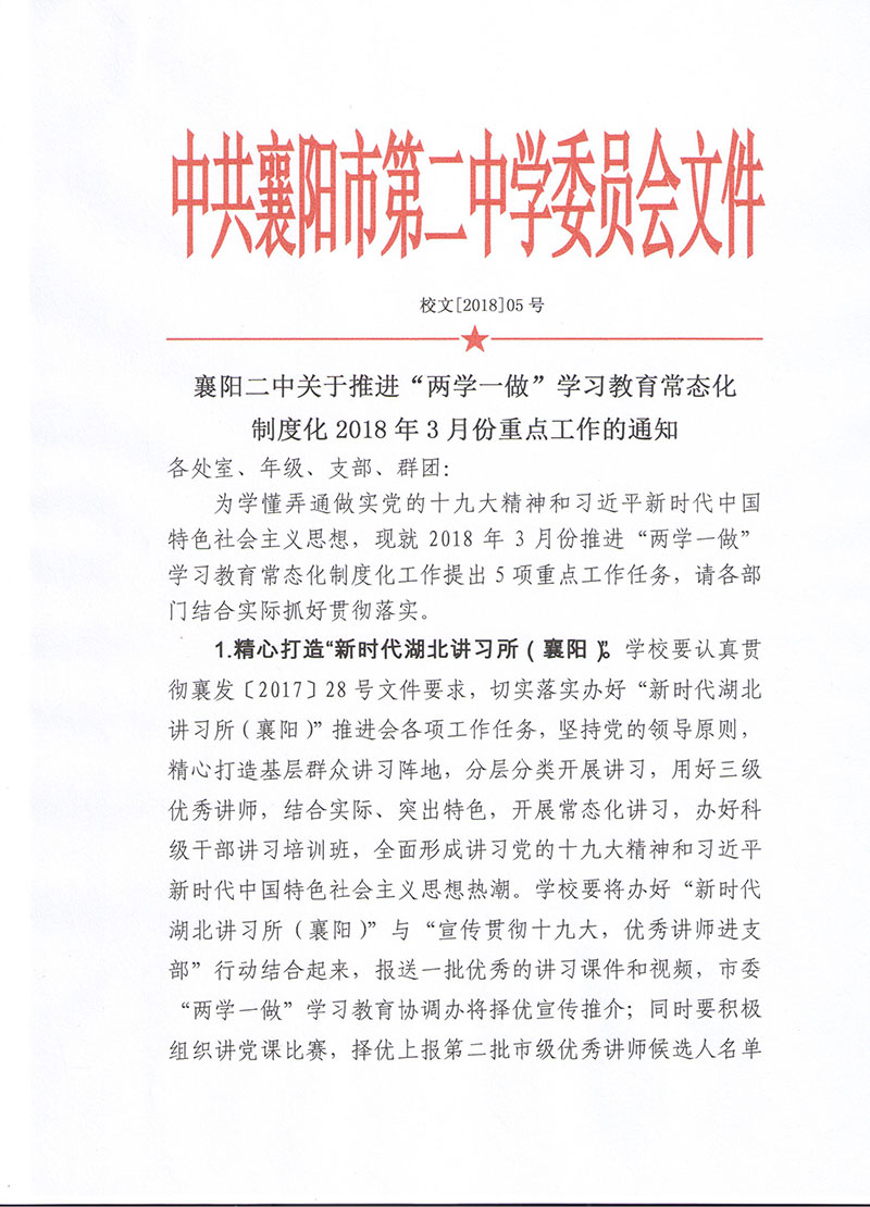 襄阳二中关于推进“两学一做”学习教育常态化制度化2018年3月份重点工作的通知
